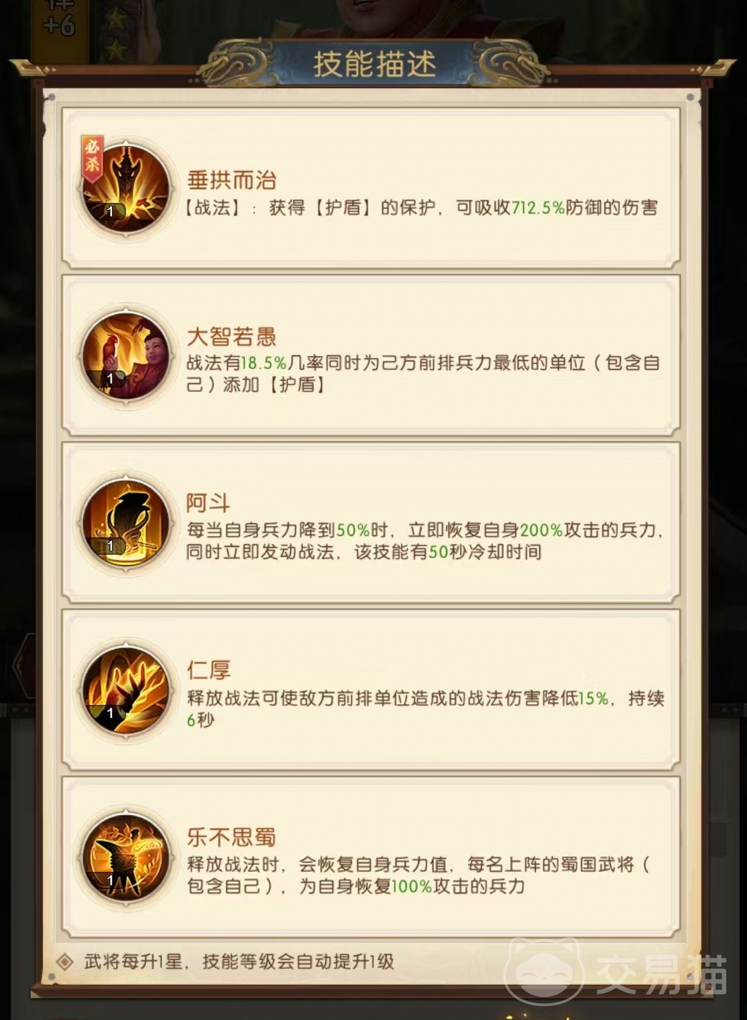 在游戏中,刘禅是属于一名肉盾型的角色,它可以放到前排去吸收大量伤害,这和它的诸多技能效果是分不开的。战法垂拱而治,自身获得护盾保护,可以吸收712.5%防御属性的伤害,这个护盾可谓非常坚固,能够让刘禅在前排屹立不倒的重要原因。第1个被动大智若愚,释放战法时有18.5%几率同时为己方前排兵力最低的单位添加护盾。这样既保护了自己,又保护了前排的其他队友。
