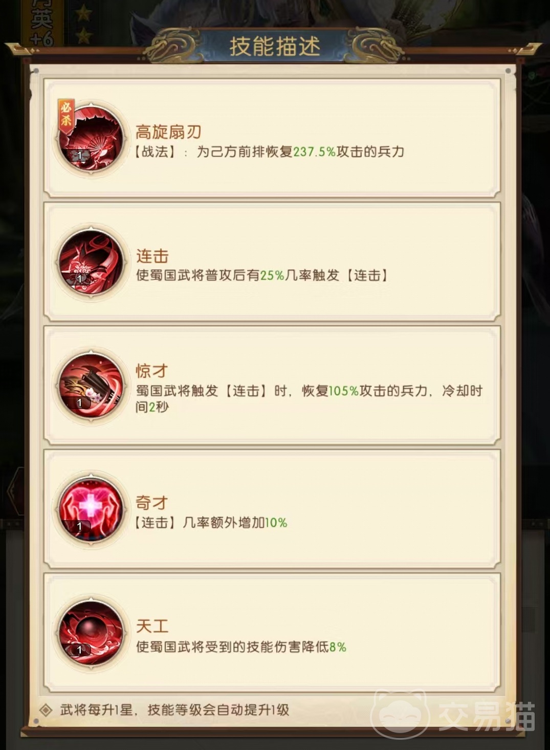 黄月英的技能效果并不是打出伤害,而是给队伍带来很好的治疗续航能力。大招高旋扇刃,可以为敌方前排恢复237.5%攻击力数值的兵力。第1个被动连击,使蜀国武将在普攻之后,有25%几率触发连击。第2个被动惊才,在蜀国武将触发连击时,可以恢复105%攻击力的兵力,冷却时间2秒钟。第3个被动奇才,连击几率额外增加10%。最后一个被动天工,蜀国武将受到的技能伤害降低8%。