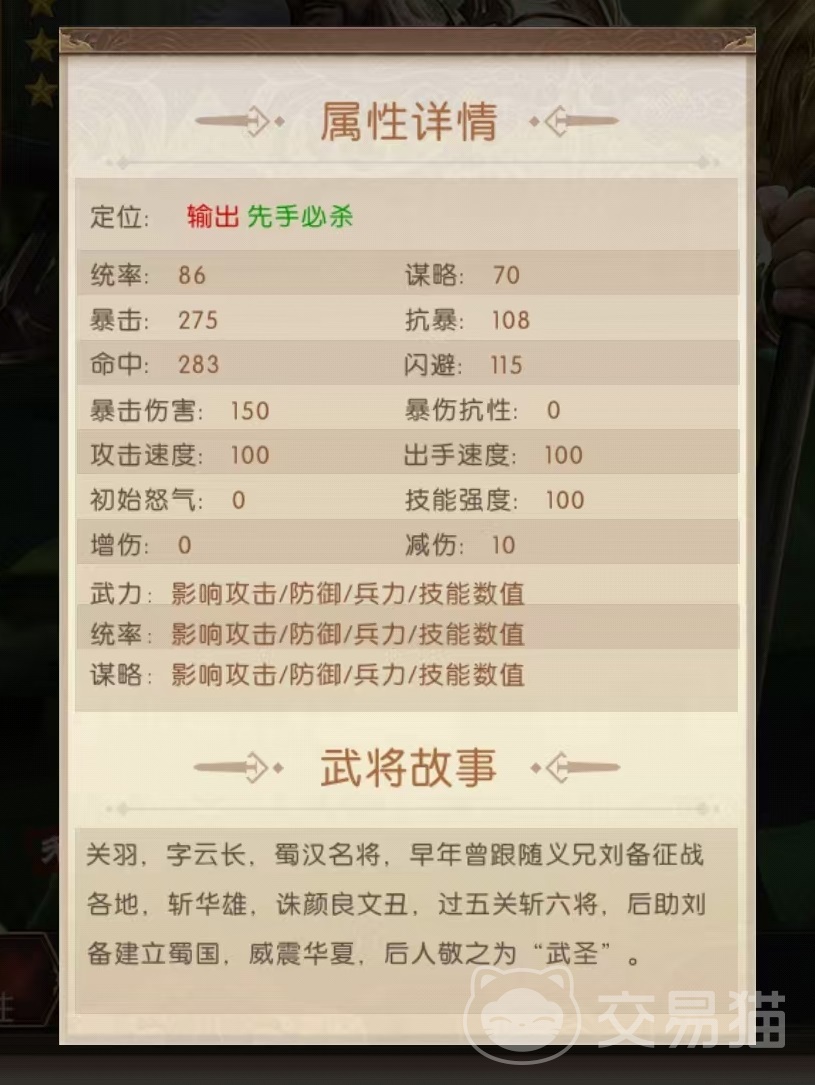 关羽在游戏中的定位是属于先手必杀类型的输出,因为自身资质高,所以属性方面非常出色,比其他的橙卡英雄都要强势一些。在进行突破之后,开场直接释放战法并恢复自身怒气,首次战法的暴击率和暴击伤害都有提升,所以在关羽第1次出手的时候就可以造成很大的伤害。他自身的必杀技是破阵斩,发动一次青龙偃月斩,对纵排敌人造成高达522.5%攻击力的伤害,阵容中蜀国武将越多,伤害也就越高。