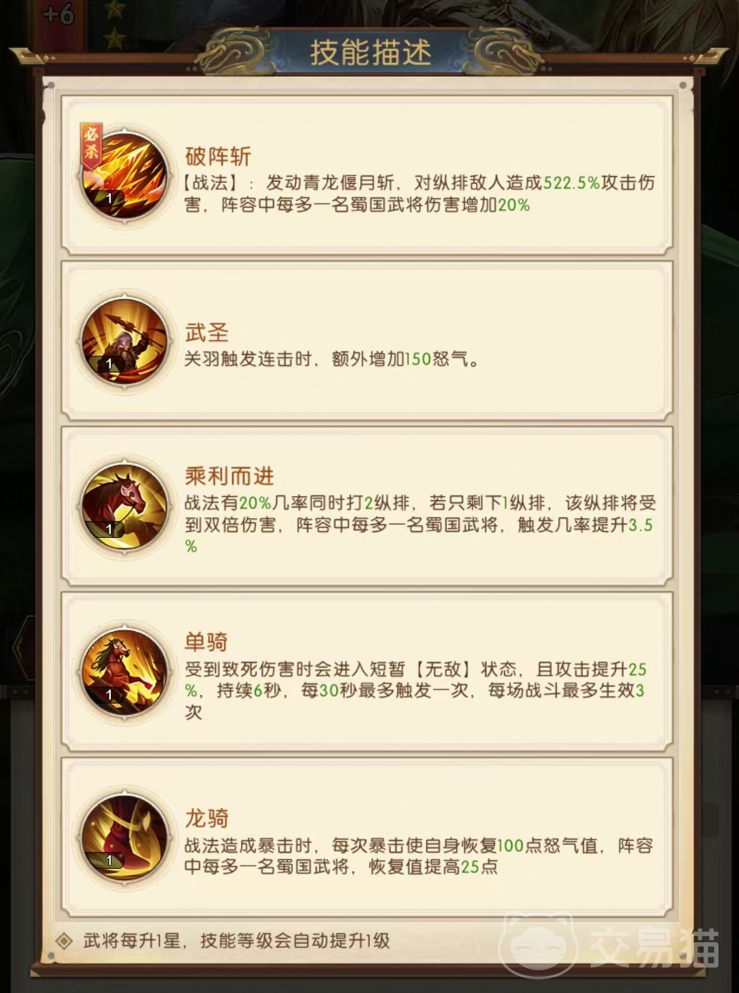 关羽这些技能每一个放到其他武将身上都可以使其实力大增,现在结合在一起,自然展现了自身的绝对优势。不仅输出伤害高,在怒气恢复方面也非常出色,经常可以出现频繁打出大招的效果。单骑所带来的免死,每场战斗可生效三次,关羽完全不用惧怕对方的输出。