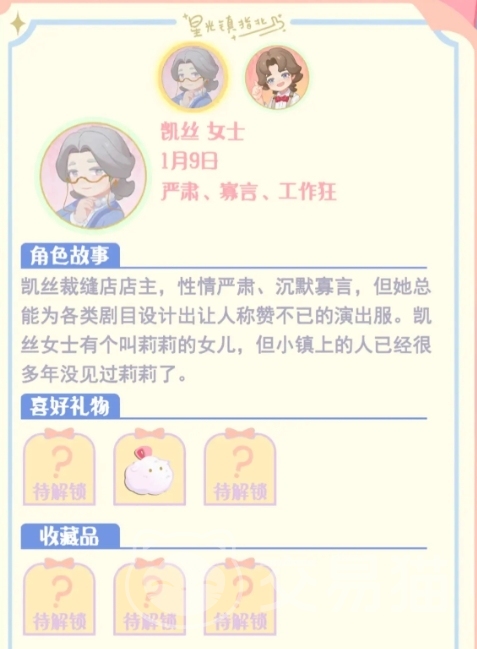 2、凯丝太太:她是裁缝店的店主,她性格比较严肃而且比较低调,她比较喜欢蝴蝶胸针、手机挂件;如果送的礼物凯丝太太喜欢的会回礼【缝纫机】。