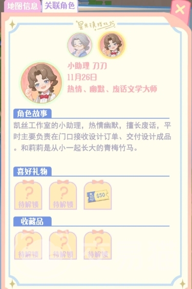 3、刀刀:她是裁缝店里的小助理,她就比较热情幽默了,但是她话比较多。她就会比较喜欢戏票票根、新书优惠券;