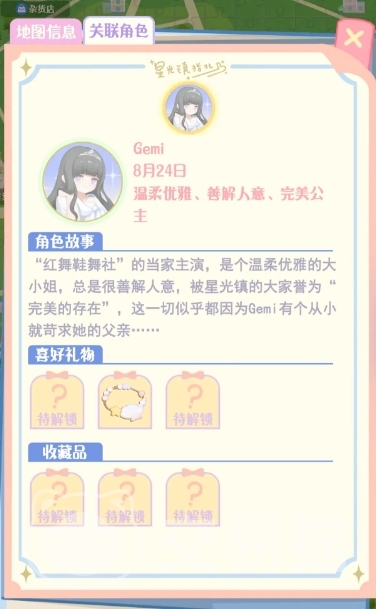 4、Gemi:她是屋社的主演,她非常的温柔也很善良,她可以说是星光镇的代言人。她比较喜欢珍珠手链、马克杯;