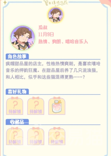 1、瓜叔:瓜叔是疯帽甜品屋的店主,他性格热情爽朗,在礼物上喜欢酷酷的香水、扭蛋;