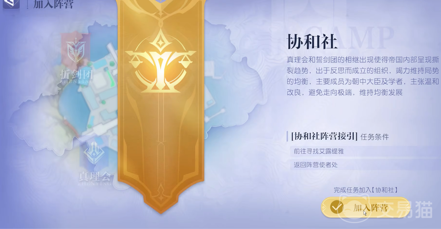 阵营使者的名字叫做杰斐特,并且他所创办的阵营叫做协和社。如果我们想要加入某个阵营的话,那就领取这个阵营的试炼任务。这种阵营主张的思想概念就是温和改良,并且维持当前局势的均衡。避免某个阵营或者势力走向极端,保持均衡的发展。