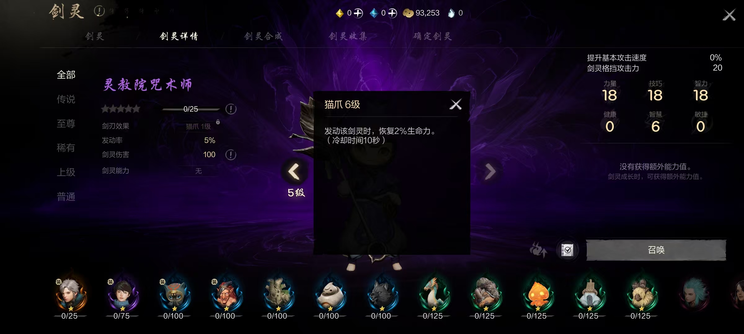 先来看一下灵教院咒术师自身在剑灵效果方面的属性,可以增加20点剑灵格挡攻击力,还有18点力量,18点技巧和18点智力以及6点智慧,并没有其他的额外能力值,这也符合稀有品质的特点。该剑灵也是可以提升星级来增加额外属性,例如升到满星时,无论是攻击力、护身还是贯穿力等都有提升。
