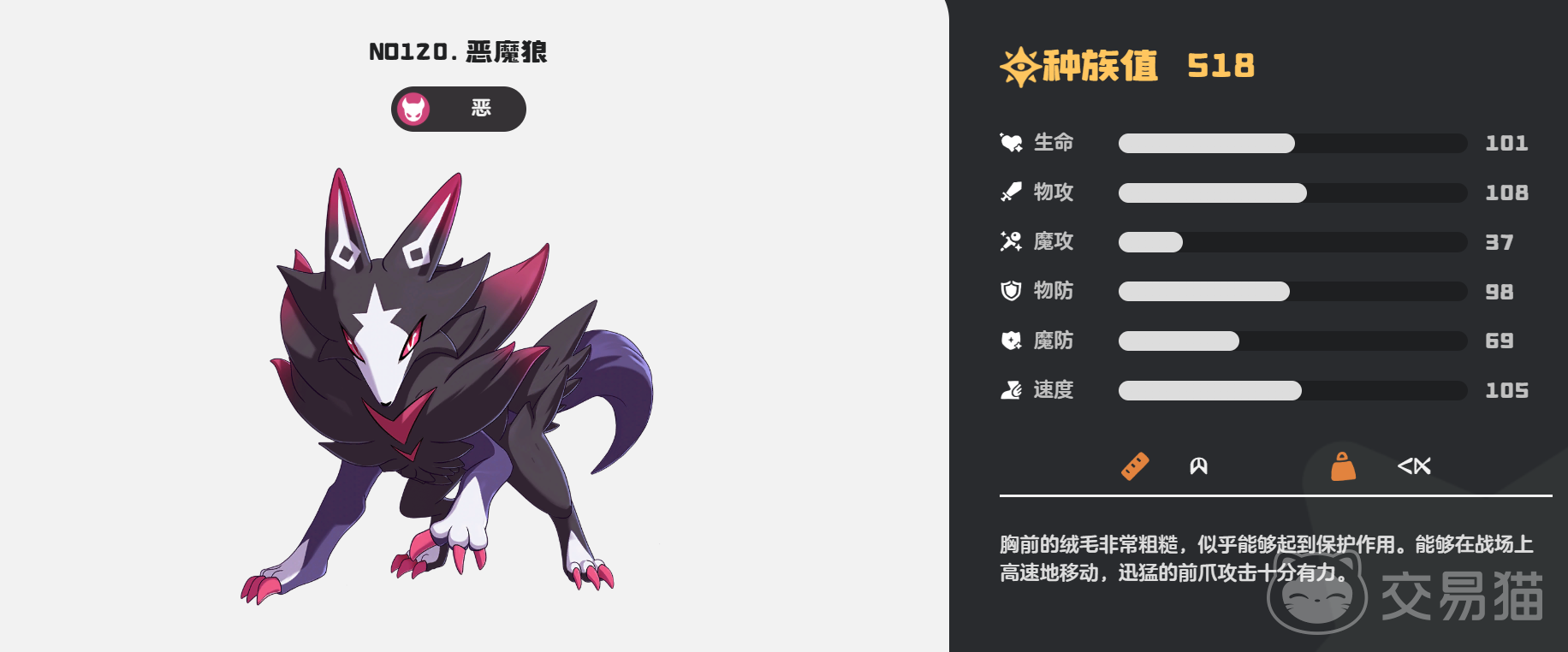 其实恶魔狼还具备死神契约的特色技能,在战斗的时候,它可以持续性的恢复生命值,也能够有效的增强生存能力,因此恶魔狼在游戏当中也可以作为辅助。当然它的回击技能在对手先进行攻击以后,一旦触发这个技能将会触发双倍的威力,要是再搭配高攻击的种族值,反而会出现反杀的情况。