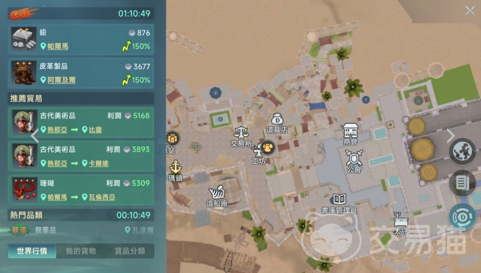 除了这些还有出货港需要注意,因为不同的出货港带来的收益不同,玩家可以在货物分类选项中找到最便宜的出货港,这样可以降低贸易的成本,在货物分类中还可以找到最赚钱的出货港,这时候就可以前往最赚钱的出货港来出货赚到最多的钱,获得大量的海币,而每个城市还有投资功能,投资有前景的城市可以获得长久地收益。
