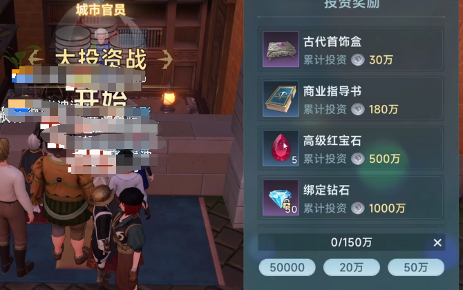 游戏里大投资战有三种玩法,一种玩法是所有人都接取任务,然后去指定的城市开启单人投资,玩家可以在这里投资银币,然后银币就会运送到下一个城市,投资可以获得双倍的经验,然后玩家就可以可以选择和其他成员组队,护送从另一个城市出发的投资船,也可以选择和其他成员组队打劫护送船只,这种玩法是不消耗体力的,获胜之后还能获得战斗经验,等到一个小时之后玩法结束,这时候会根据玩家的表现显示出积分,玩家可以直接领取积分奖励。