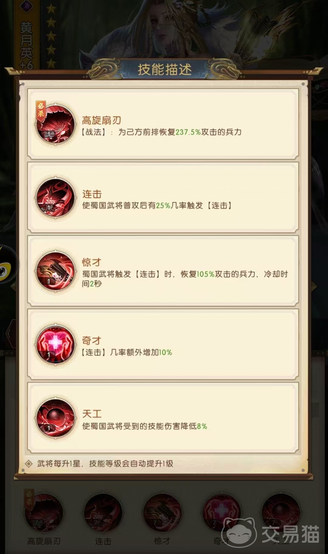 【惊才】在蜀国武将触发连击效果的时候,这个技能生效将在2秒的时间内回复攻击力105%的兵力。【奇才】技能效果也是将连击的几率额外增加10%,让连击的速度更快的提升。【天工】是将蜀国武将受到的技能伤害降低8%。