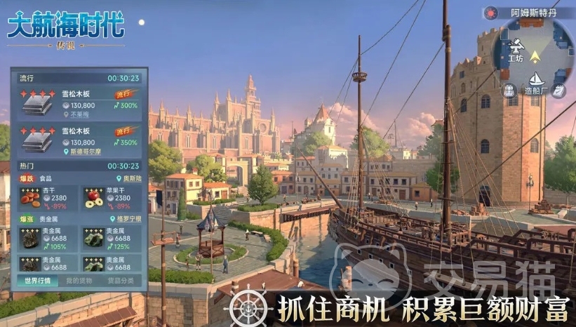 右上角的小地图是航行中的重要辅助工具,它清晰地标注出玩家当前所处的坐标,轻轻一点即可跳转至大地图,方便玩家从宏观角度规划航线,在大地图上玩家可以清晰看到各个港口的位置、航线走向,以及周边海域的大致情况,航速信息也在小地图中展示,游戏中的天气系统极为逼真,风力、风向、浪高等因素都会对航行产生显著影响,顺风时船只仿佛被一双无形的大手推动,航速大幅提升,逆风则如逆水行舟,航速减慢,消耗的资源也相应增加,因此玩家需要密切关注天气变化,合理规划航行时间和路线。