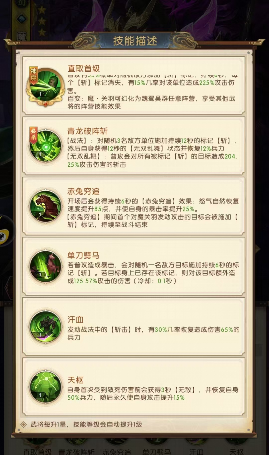 战法【青龙破阵斩】,对随机的单位敌人进行标记,在标记的同时关羽获得2s的无双乱舞能够回复12%的兵力,对有标记的敌人造成204%的攻击伤害。【赤兔穷追】提升战法的暴击,并且持续到战斗结束。