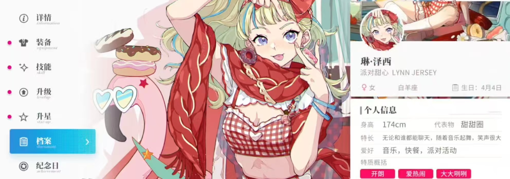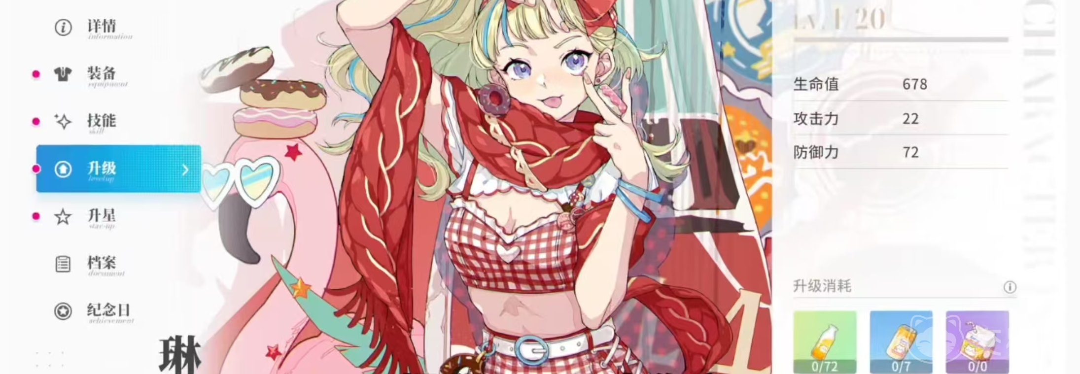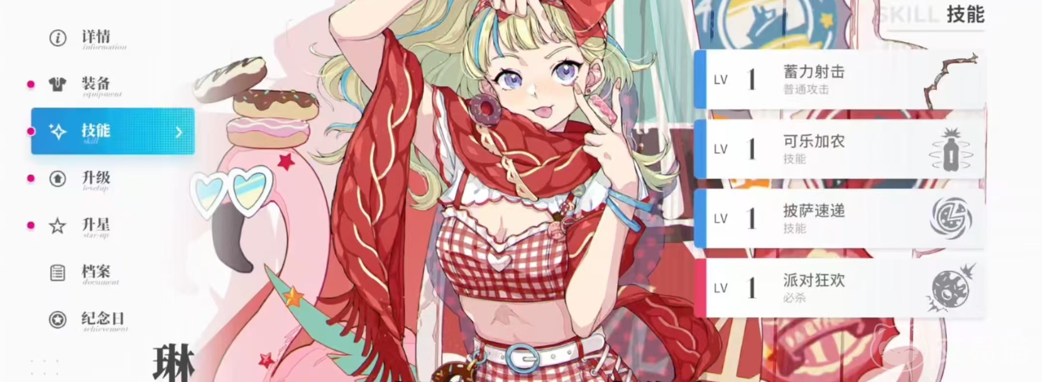 第2个技能是朝着面前的敌人丢出旋转的披萨饼,造成远程打击属性伤害,披萨饼在命中敌方目标时会进行分裂,分裂成小的披萨饼命中目标同样会造成打击属性伤害,分裂伤害大概是技能伤害的1/2。必杀技派对狂欢,琳带着一个巨大的甜甜圈登场,能够堆面前的敌人进行碰撞攻击,造成伤害后将其推到一边。当甜甜圈撞击到墙壁时,还可以对范围内敌人造成伤害。在移动期间,通过点击普攻按键,可将甜甜圈抛起然后落地对范围内敌人造成伤害。在推动甜甜圈移动期间,琳受到的伤害降低。