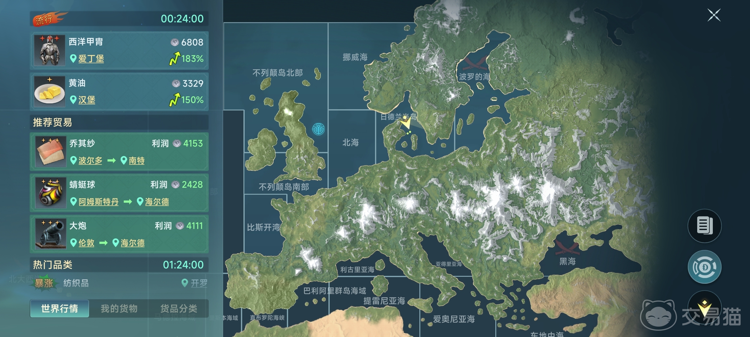 至于法兰西,它比较特别,首都在西地中海的马赛,但国家领地分散在北大西洋和北海,虽然早期路线偏远、较辛苦,但却拥有跨区港口的天然优势。像固定流行商品核桃干虽然距离长,但利润不错;而变化流行时常有羊肉、造酒等特产路线,对老玩家或愿意挑战多点布局的玩家来说反倒是一个优势。不过,不推荐新手一开始就选法国,前期节奏比较慢,而且路线跑多了容易疲惫,比较考验耐心和路线规划能力。