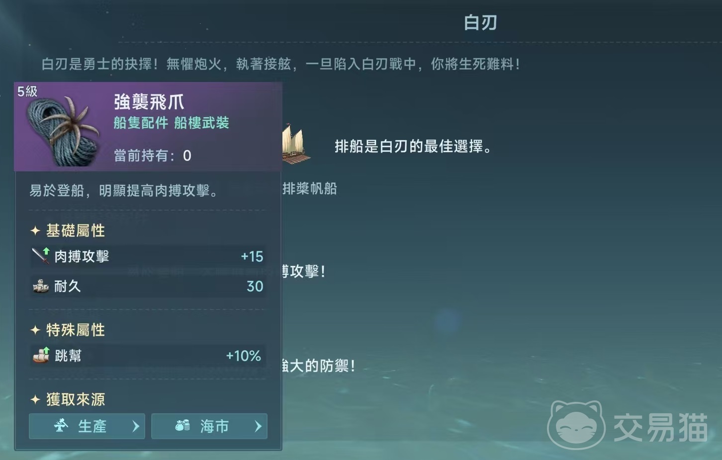 还有柚木板,可以为战船带来强大的防御,然后是中型接舷板,显著提升接舷的距离,降低接舷的难度。因为在白刃战中最关键的一项就是快速接舷,这样才能及时开始战斗。在航海士的选择方面,小编推荐帕什、艾伦奎因和菲奥雷这三个。菲奥雷的特点是能够提高白刃战属性并牢牢缠住对手,帕什可以在战斗中更快地接近对手完成接舷,艾伦奎因是帮助掠夺更多的战利品。