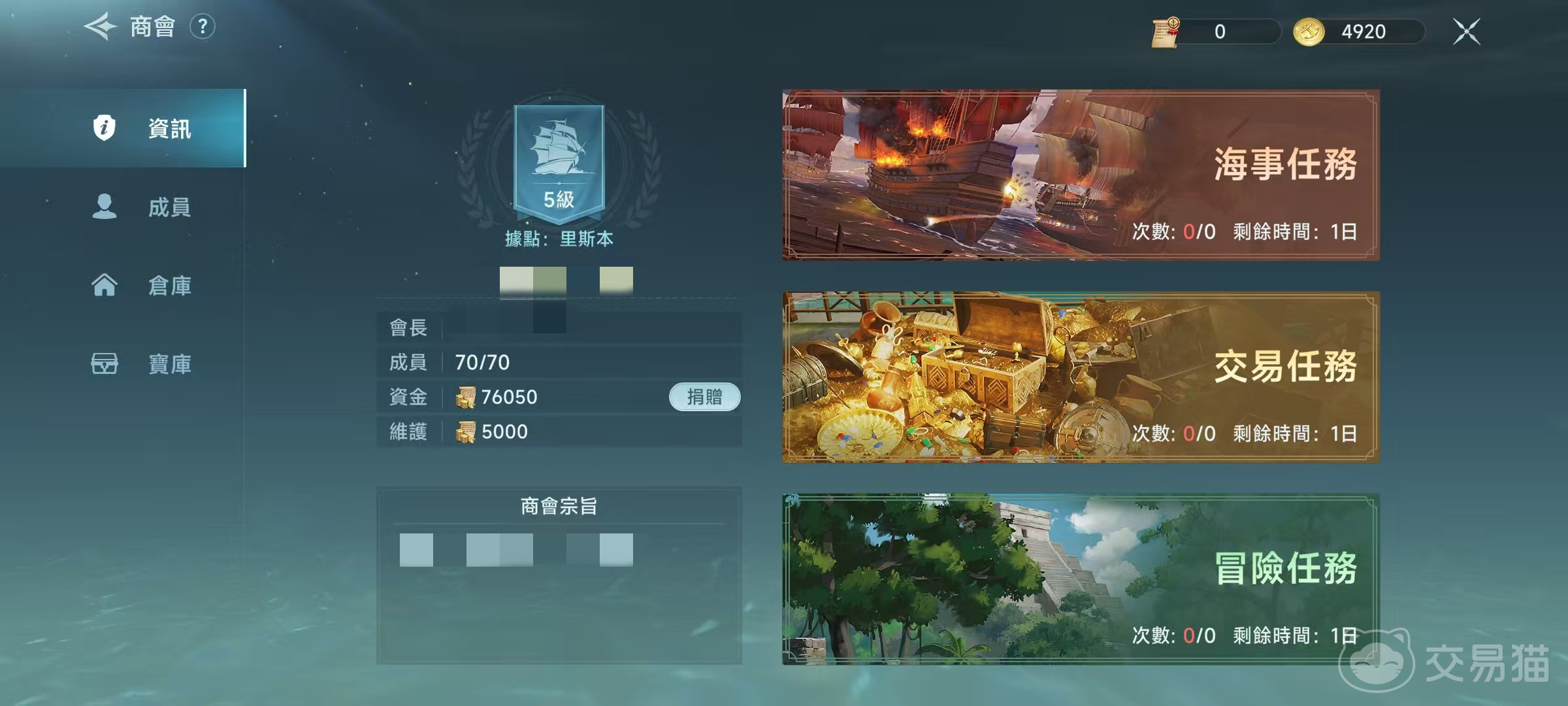 进入到商会之后可以看到有资讯、成员、仓库、宝库这几类。大家平时参加商会活动可以获得丰厚的奖励和商会贡献,部分战利品会上缴到商会宝库,这时就可以用平时积累的贡献点兑换。商会活动次数会每周更新,千万不要错过。商会也可以在各港口中建立仓库,存放交易品。商会升级和仓库扩建都需要资金,通过成员捐献的方式增加商会资金,自身也能获得商会贡献。