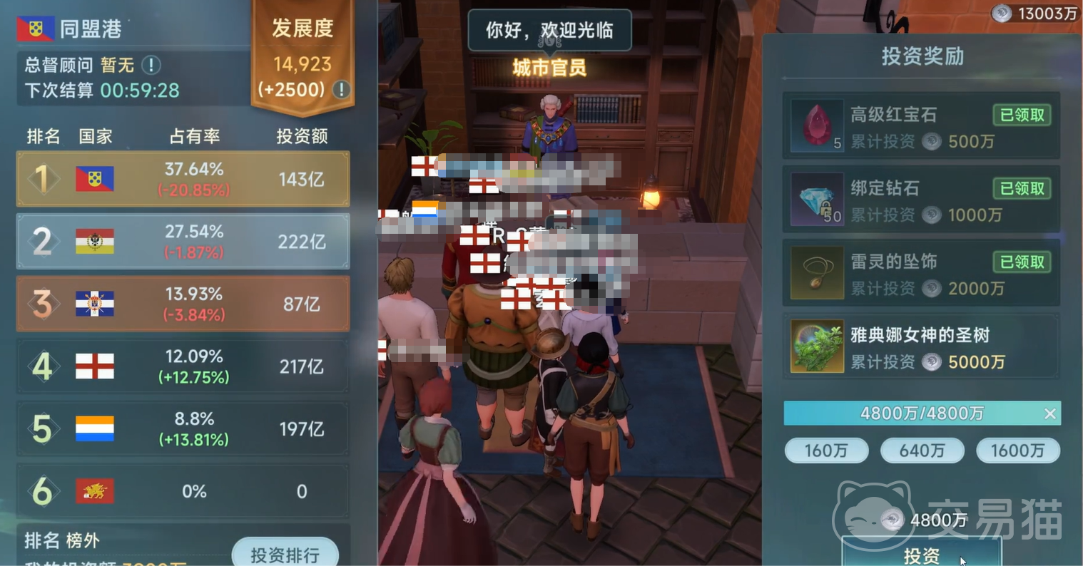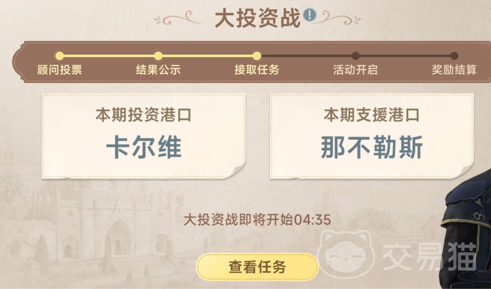 其实所谓的大投资战就是一种任务,为了彰显自己国家的实力雄厚,我们要对其进行补助或者支持。首先要先接取任务,然后准备好自己要支持的港口。例如卡尔维或者那不勒斯,并且投资战开始之后,就会进行倒计时,所以我们一定要及时领取任务。