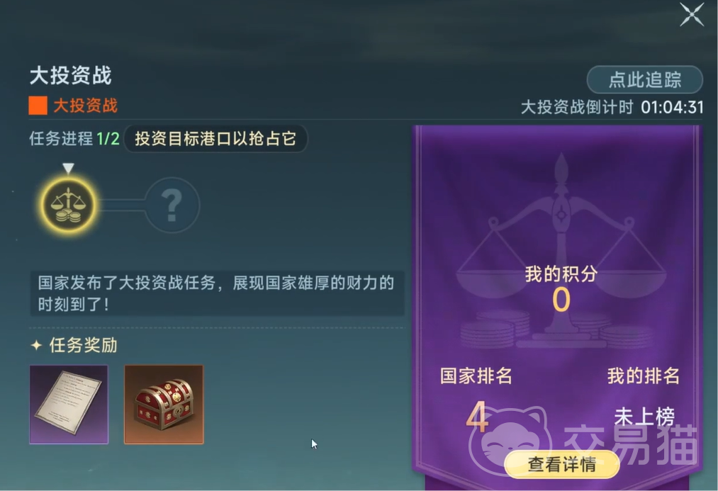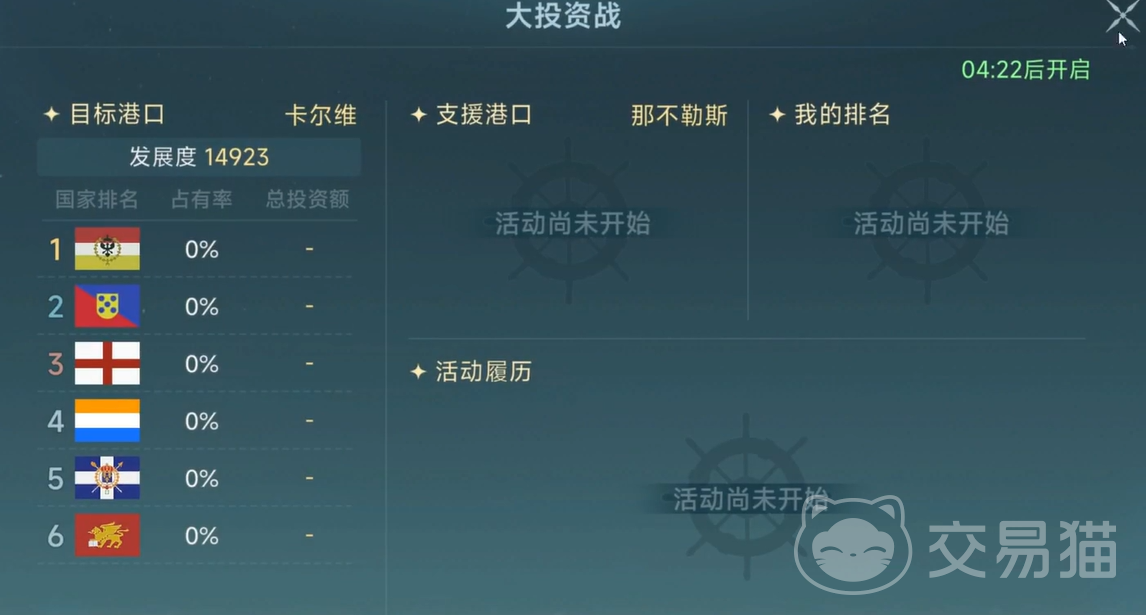 接取任务之后,我们可以看一下任务的要求。任务的要求便是要投资目标港口,并且要在限定的时间内将其占领才可以获胜。当我们还没有开启战斗或者投资时,自己的分数会为零,并且国家也不会上榜。然后我们每周都可以参加一次投资战,所以记得千万别错过。
