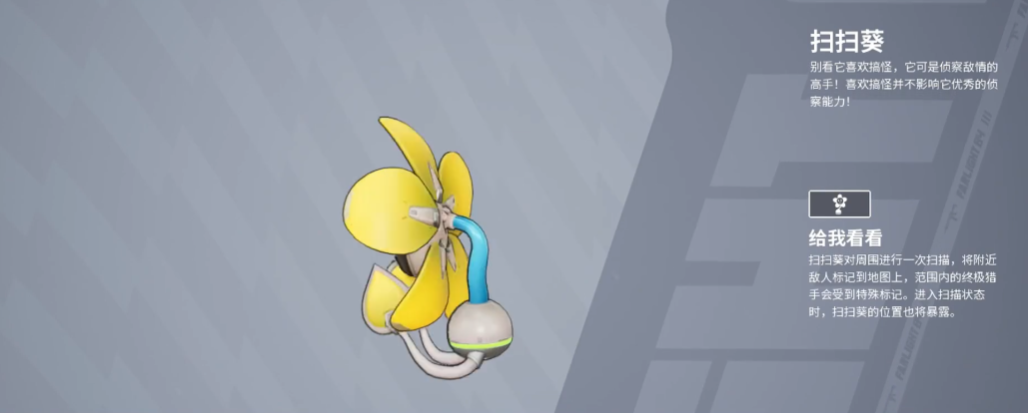 1、扫扫葵。这是战术道具类宠物,主要的效果就是探测,实际能探测的范围非常大,直接能扫描整个小地图中的所有敌方单位,有些角色也是拥有信息获取能力的,例如梅歇尔、魅影之类的,她们的探测范围比较有限,多人队伍处于一片区域时比较受到限制,而这只宠物就可以配合英雄组合使用,比如和梅歇尔的大招一块使用,她自带的高台就能让视野更加的开阔,能有效的防止位置的对手靠近自己。