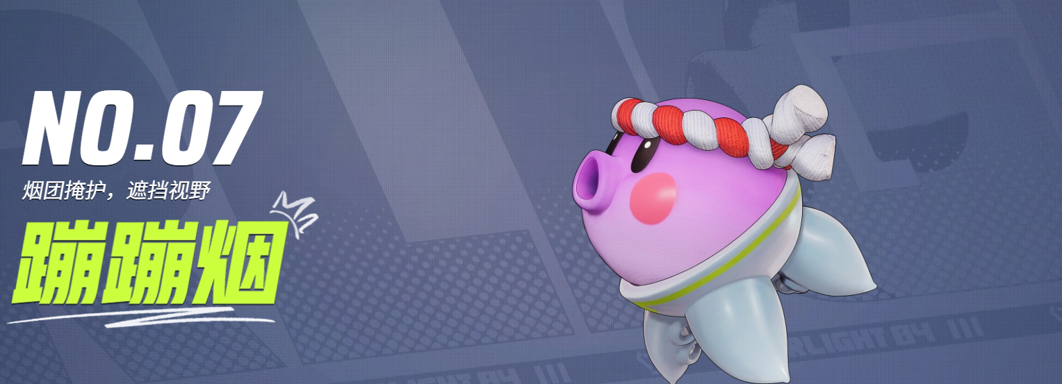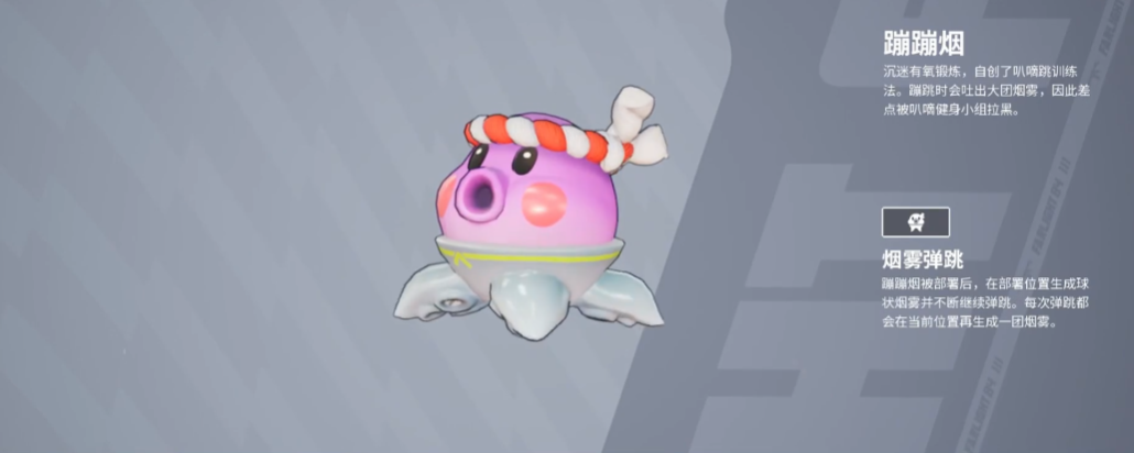 2、蹦蹦烟。这是一只拥有可爱章鱼外形的宠物,能往前进行一次弹跳,落地以及弹跳都能在当前位置生成一团烟雾,能让己方直接穿过敌方的枪线,从而达到转移自身位置的目的,使用的时候,还可以借助墙壁弹跳,使烟雾的覆盖直接最大化。