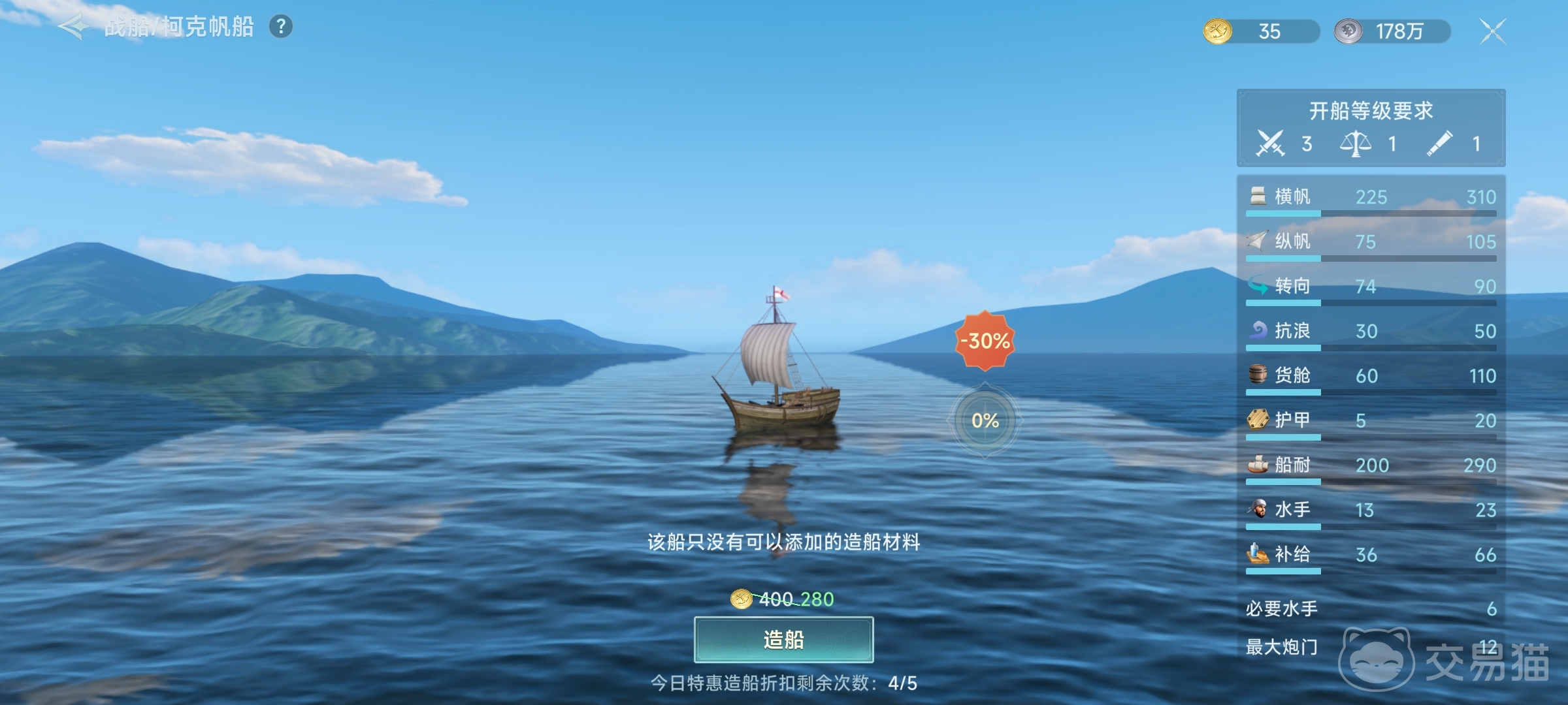 作为初期和中期的常见战船,柯克帆船较为平衡,适合多种用途。适用于早期任务、战斗及中期的海战。虽然火力和防御较弱,但机动性不错。低建造成本,适合新手上路。