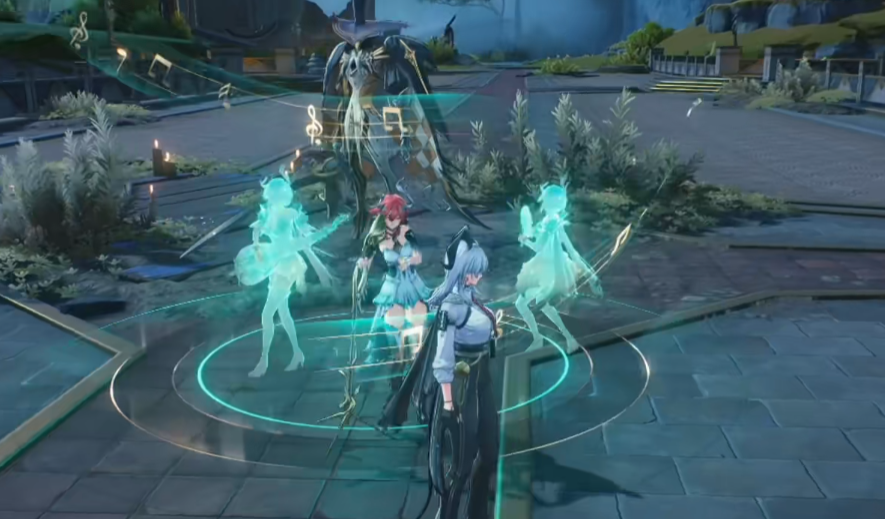虽然武器用的是手枪,但普攻是用麦克风与支架的近战,毕竟是“吟游诗人”。夏空的共鸣解放可以同时给周围目标挂风蚀效应和光噪效应,并且分为前后台两种用法,后台就是开大后离场,类似协同攻击,但也许会是一种新分类。