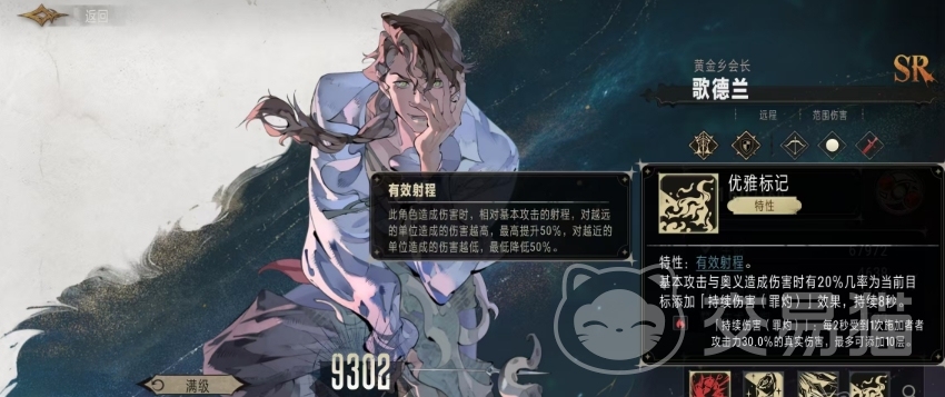 哥德兰还具备独特的特性叫做优雅标记。在哥德兰使用基本攻击和奥义技能造成伤害时,都有一定几率为目标添加持续伤害效果,这种持续伤害属于罪灼类型,其效果是使对方每两秒就会受到一次相当于自身 30%攻击力的真实伤害,而且这个伤害效果能够叠加,最多可叠加到 10层,也就是说随着战斗时间的推移和伤害的不断叠加,敌人所承受的伤害会越来越高。