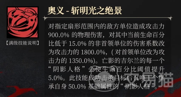 哥德兰的奥义技能名为最终华丽谢幕,这一技能展现出了强大的范围伤害能力,在战斗中当哥德兰释放这一技能时,需要消耗四点奥义点数,随后他会对指定目标以及该目标身后扇形范围内的敌方单位造成高达 413%攻击力数值的物理伤害,这一高额的伤害输出还是很适合做大招的,虽然比不上SSR的大招输出强,但是在SR里面还算不错了。
