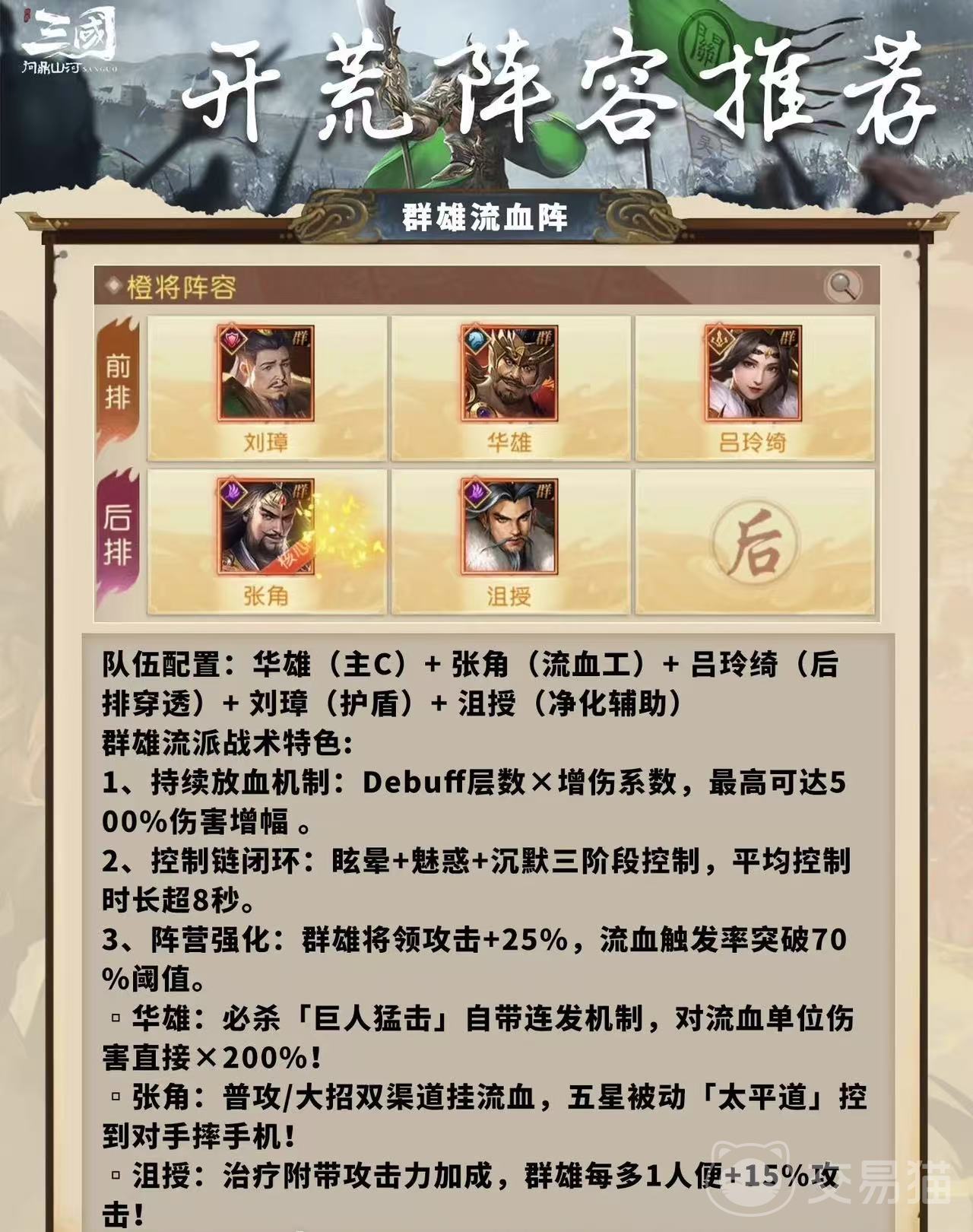 这套群雄阵容主要依靠武将技能不断给敌方叠加流血状态。一旦敌人进入流血状态,后续对其发动的攻击就会造成额外伤害。随着战斗推进,流血状态反复叠加,额外伤害也不断累加,形成一个持续的伤害循环,使得敌方血量持续快速下降。