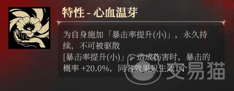 安普莎独特的特性叫做心血温芽,这一特性是当血源爆发等级攀升至2级以上时,才会有更好的效果,此时安普莎便能够唤醒内心深处的潜能,为自己施加一种名为暴击率提升的力量,这一力量可以使她在战斗中的暴击概率永久提升20.0%,这种提升并非转瞬即逝的瞬间爆发,而是不可被驱散的加持,每当安普莎挥舞着红枝,或是释放出奥义技能时,暴击率提升都会发挥作用。