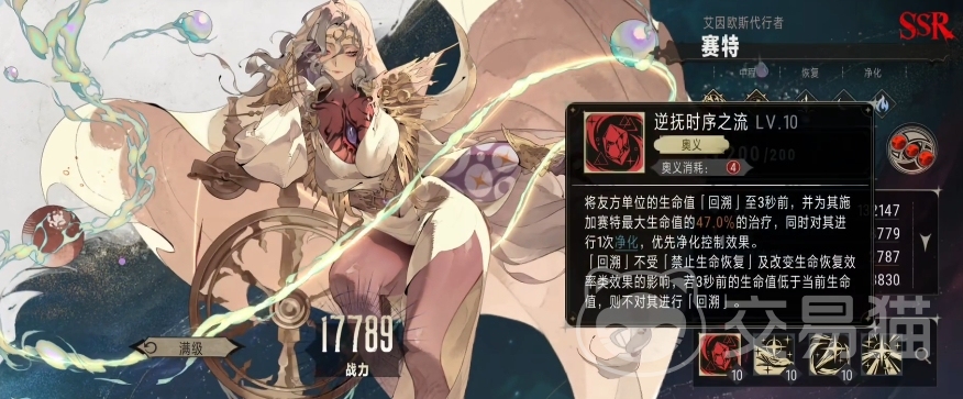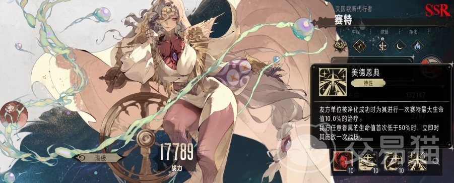 然而赛特的自身特性却远非如此简单,她的自身特性有着独特的机制,当友方单位被净化成功的时候,赛特就会触发一次治疗动作,按照自己最大生命值的 10%来为该友方单位恢复生命值,这一特性使得赛特在与具有净化能力的队友配合时,能够形成一个有效的生命保障体系,不仅如此,当我方任意一名成员的生命值首次低于 50%的时候,赛特还能够立即对其释放一次战技。