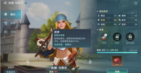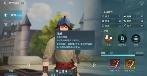 2、探险家,这是擅长远距离航海的一种职业,在遇到一些危机情况时,拥有很强的应变能力,”视认”技能,能发现海域,遗迹,以及天体,也能发现海上的漂流物;考古学技能,可收集历史相关情报,或者鉴定发现物;采集技能,能采集各种原料物品,陆地和海上采集获得交易品可获得冒险经验,每天调度,采集,搜索能获得600次冒险经验;钓鱼技能,可以在海上或港口岸边钓鱼;救助的技能可营救无法航行的舰队成员以及落水的船员;最后是驱除的技能,能处理老鼠或者海草造成的伤害。