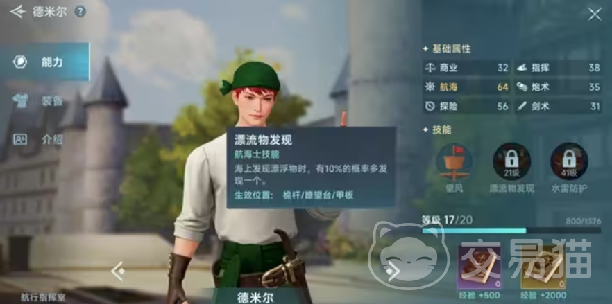 当大家获得西地中海入港许可证,并做完正义与强权任务后,德米尔会加入我们的队伍,他的定位属于辅助,“漂流物发现”能在海上发现漂流物的时候,有10%的几率多发现一个,这个可以与中后期改造船只的高级监视台进行搭配利用,“水雷防护”,能防护擅长水雷攻击的玩家,由于其技能方面没有太大的亮点,所以不太推荐大家优先培养。