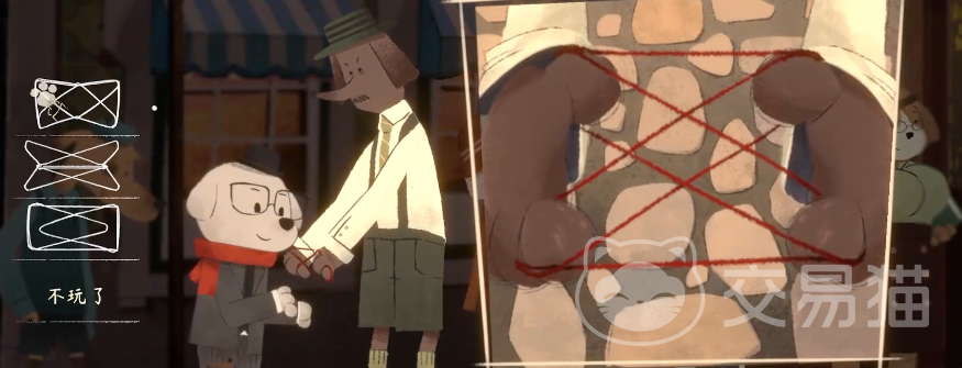 到面包店门口后会发现水果店老板正在和人吵架,两人都在说对方的车撞了自己的,导致我们去朋友家的路被封,这里先和事故旁边的两位侦探对话,他们对事故原因有结论,但是需要我们自己去找几个线索,我们先点击撞车的小灰能得到第一组线索,再点击一下相撞的车能得到第二组,然后到面包店门口和带绿帽的先生玩翻花绳,记住第一次翻选第一个选项,第二次选选项三,第三次选第一个就顺利获胜,赢了后他会把花绳送给我们,然后走右边来到后面的小巷。