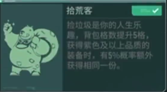 拾荒客的技能能够将玩家的背包进行扩容,这个扩容还是永久性的。在基础的背包上增加了5个容量,并且在玩家开箱和收取资源时稀有物品的概率高,会有移动速度的buff叠加。保安职业为玩家提供的是防御力。