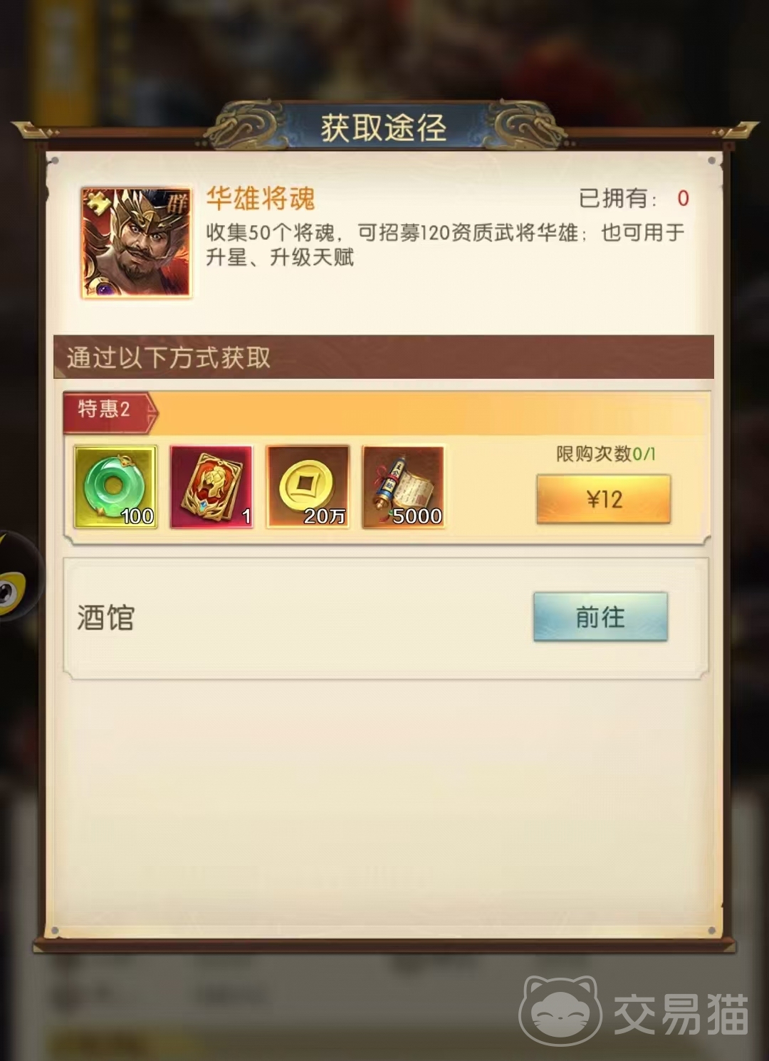 华雄角色的阵营是群雄阵营,在游戏中也是一位橙色武将。作为骑兵他的输出能力和伤害可想而知,目前在游戏中获取该角色的方法是通过日常招募或者12软妹币充值获取。不过游戏福利很多,积攒招募令应该是能够抽取到角色的。