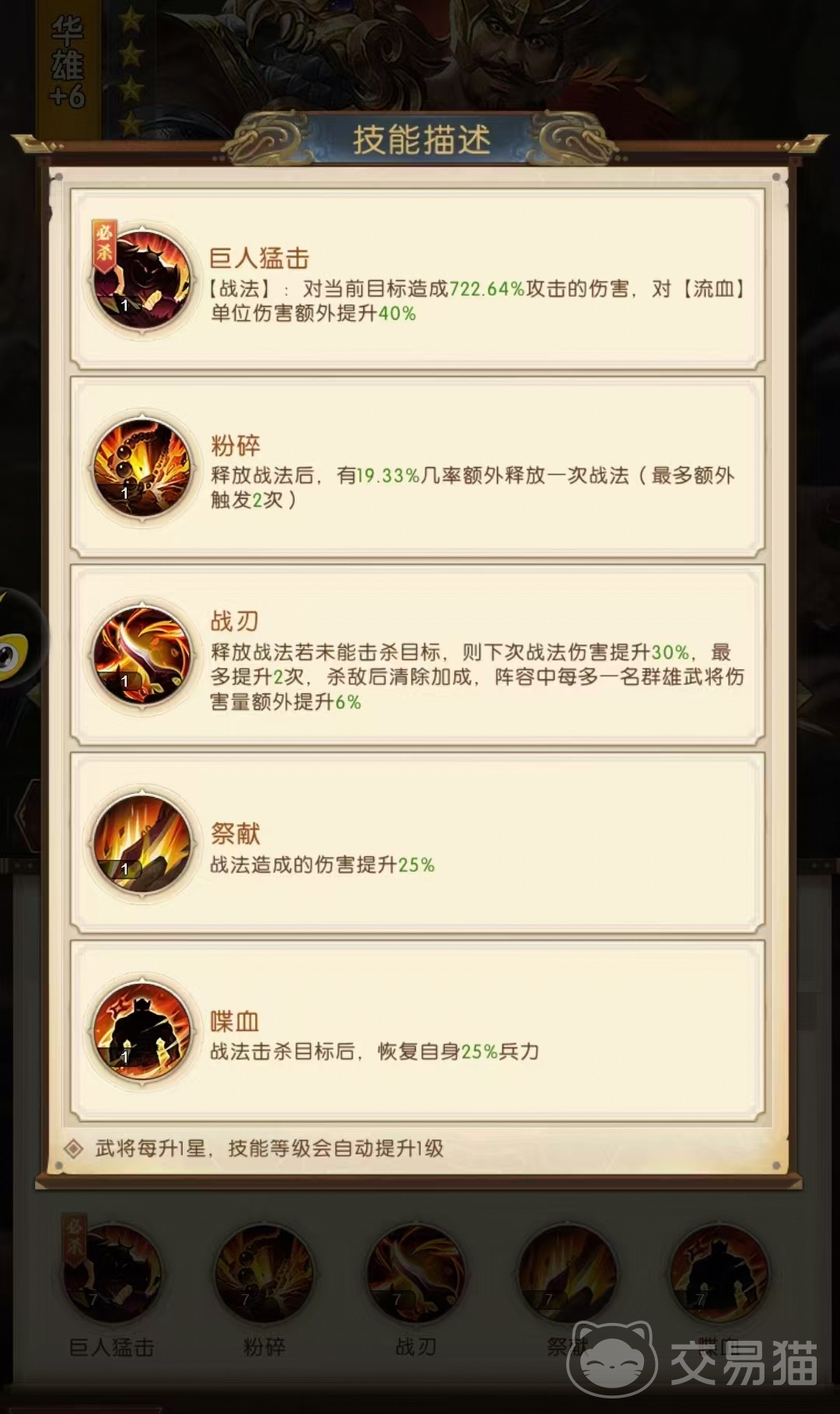其余的技能都是要武将进行突破之后慢慢解锁,但是威力也很强大、技能【粉碎】能够真正释放战技之后有jiejin20%de机会再释放一次战法技能,不过最多触发2次。【战刃】是为战法叠加buff,将战法的伤害进行提升。【献祭】能够提高25%的战法伤害。