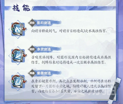 紫薇剑法:可以在身后凝聚冰剑,在点击发射之后,就可以留下一大片的冰霜之地。可以持续性的给敌人产生水属性伤害,并且每一次伤害还会增加寒霜。因此在这些细节上就应该注意起来,合理搭配之后就能拥有好的作用。