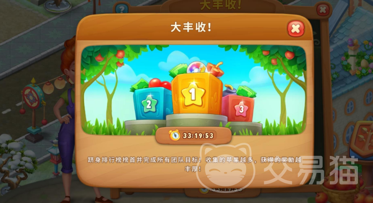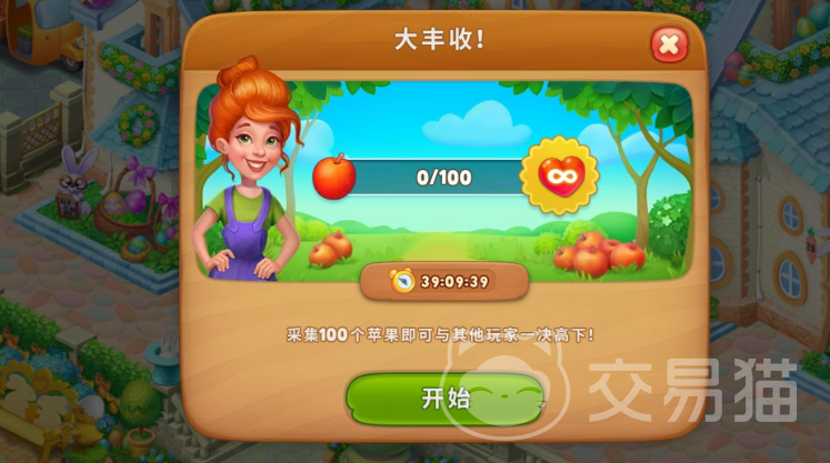 当满足以上条件之后,小伙伴们就可以从活动界面中打开大丰收这个玩法了。此时你将会看到系统向你提出的第1个条件,也就是需要你在指定的时间之内收集满100个苹果,具体的收集方式就是通过合成玩法来获得了,如果说你能够通过系统给你安排的关卡,那么收集的苹果数量就会被记录,如果不小心失败了,那就只能从头再来,之前的苹果也会全部被清零哦。