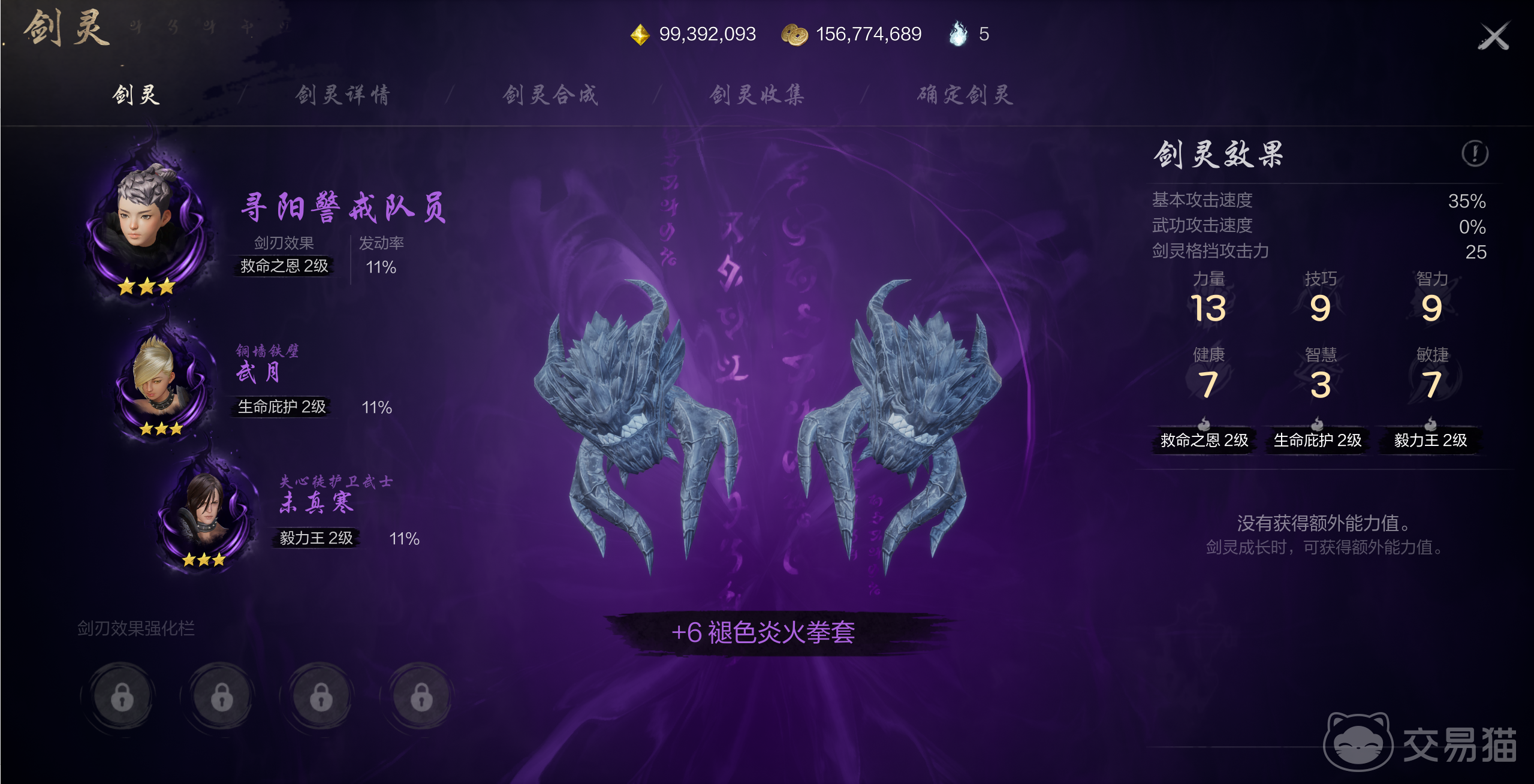 能和武月搭配使用的剑灵有寻阳境界队员以及未真寒等,寻阳警戒队员可以作为拳套的主教零,武月和未真寒则为副剑灵,他们的组合在一起产生的剑刃效果为救命之恩配合生命庇护以及毅力往。