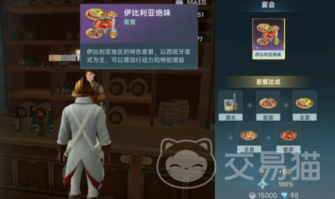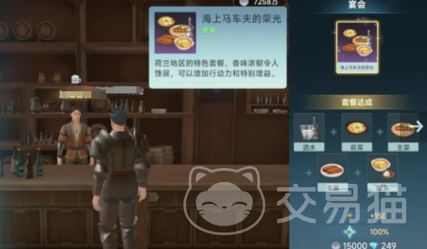 假如玩家手中的钻石比较多,就可以选择价格更高的菜品搭配,可以在酒水上选择杜松子酒,搭配上干酪奶汁烤菜作为前菜,主菜可以选择脆皮烤猪,搭配上酥油面包作为主食,在配菜上可以选择卡莱利亚浓汤,这几个组合下来需要消耗249钻石,这是游戏里的特色套餐,是只有在荷兰地区才能吃到的。
