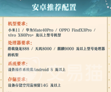 是对手机配置并没有太高的要求,如果是iOS版本, a14以上处理器即可,如果是安卓版本,处理器方面主要选择天玑8000,麒麟9000,设备操作系统起码需要安卓8以上。设备储存的空间要预留14G及以上。