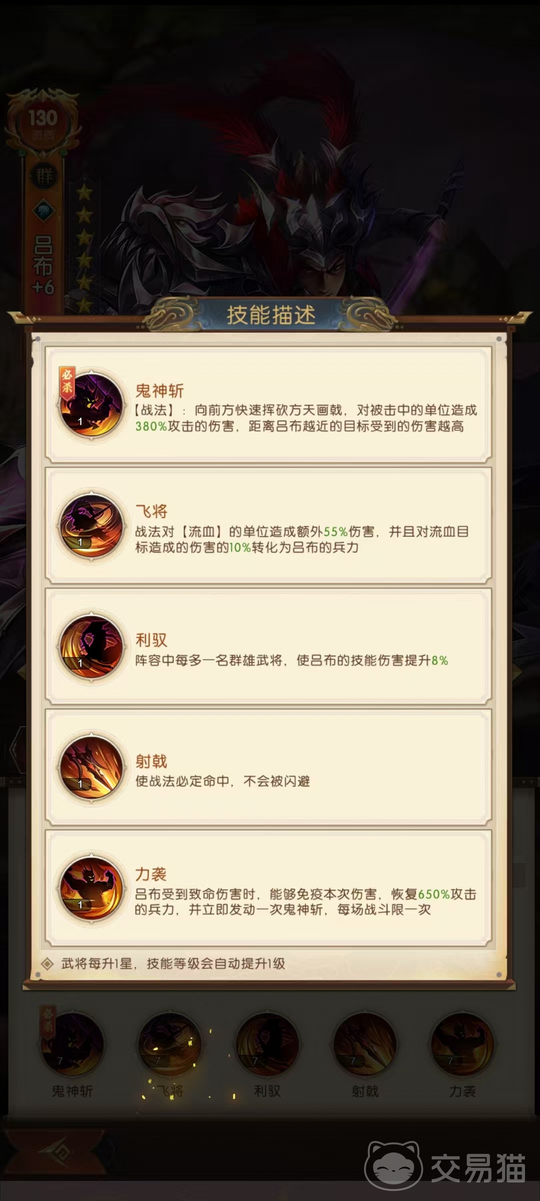 吕布他的一技能“鬼神乱舞”为主动技能 ,有40%概率发动,能对敌方部队造成高额武攻伤害,伤害率达200% ,并且会让自身获得持续2秒的免疫状态,不受减益状态影响。当自身武力减去目标主将武力的差值大于50时,伤害率还会额外提升150%,输出瞬间爆表。二技能“天下无双”是被动技能,自身对距离小于等于2的目标造成的所有伤害提高40%,部队受到距离大于1的所有伤害降低20% ,不过受到大于等于3支部队攻击时,伤害提高效果会失效。