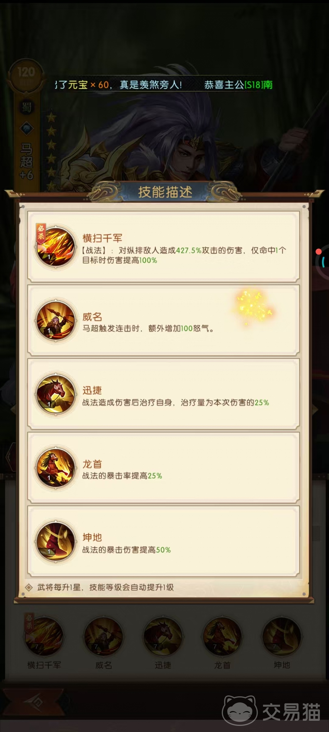 马超作为《三国问鼎山河》中兼具输出与生存能力的核心武将,其技能机制与阵容搭配需围绕连击回怒与单体爆发展开。他的战法「横扫千军」能对纵排敌人造成427.5%攻击伤害,若仅命中单个目标时伤害翻倍,配合「威名」技能在触发连击时额外增加100怒气,可快速提升战法释放频率。同时,「迅捷」提供的25%伤害治疗效果与「龙首」「坤地」带来的暴击率及暴击伤害加成,使马超在输出的同时兼具续航能力,适合作为前排抗伤输出。