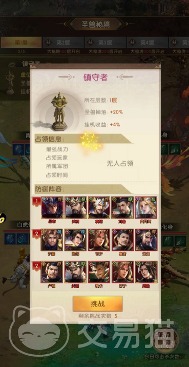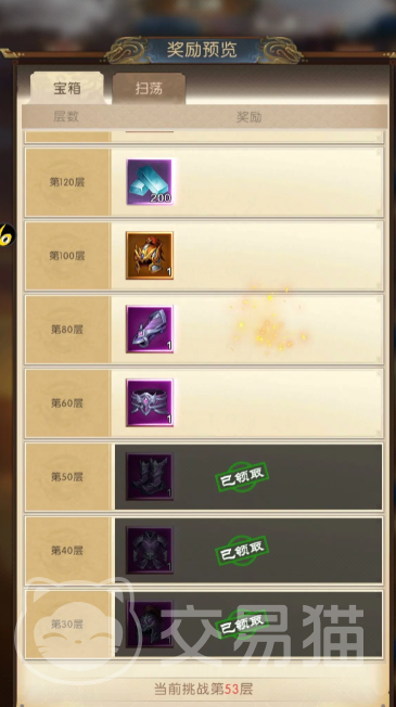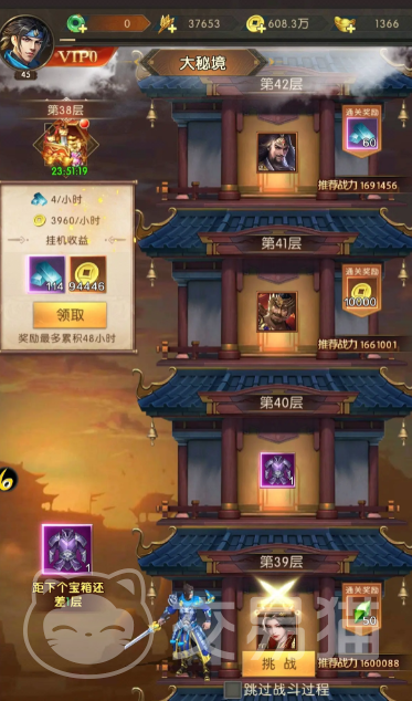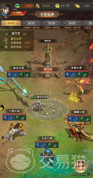 其次,这个副本中还有两个特殊的玩法机制,①扫荡功能,他会在通关15层后解锁,并且当玩家可扫荡已通关层数获取奖励,每日首次扫荡免费。层数越高,奖励越丰厚,这为玩家节省了不少时间,让他们可以更专注于挑战更高难度的关卡。②圣兽秘境,他会在通关50层后开。其中,圣兽秘境中有五只圣兽,对应五个装备化身。每日可击杀5次化身,次数可累积10次。击杀圣兽有机会获得首饰装备,击败镇守者可增加掉落几率并提升挂机收益。这不仅增加了游戏的趣味性,也为玩家提供了更多的获取稀有装备的机会。