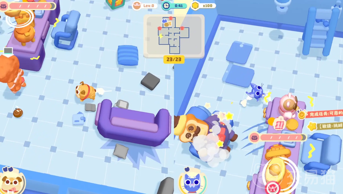 再次,游戏内设有多样化的游戏模式和地图。游戏提供了对抗模式、剧情模式、街机模式等多种玩法。在对抗模式中,玩家可以选择扮演主人或宠物,进行拆家与抓捕的对决;剧情模式包含了丰富的关卡和任务,让玩家体验宠物与主人之间的故事;街机模式则提供了多种小游戏,如投掷训练场、梦魇幻境等,为玩家带来额外的乐趣。同时,游戏场景包括家中、沙滩、公司、古堡等多个地点,每个地点都有不同的地形和道具,为玩家提供了丰富的破坏对象和策略选择。
