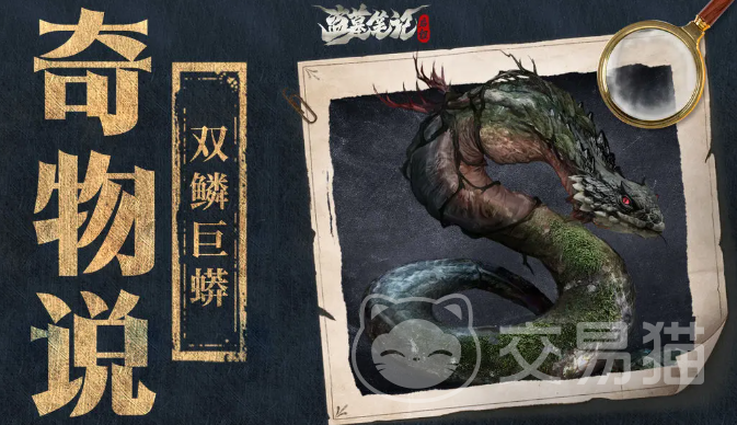 双鳞巨蟒主要栖息在西王母国,它长得像树蟒,最粗的地方和水桶一样,鳞片是双层的,非常厚实还会在光线下反射褐金色的光芒,它虽然有着庞大的身躯,但却能在树枝之间灵活移动,几乎没有任何动静,据民间传说,它的鳞片还能给人带来幻觉。