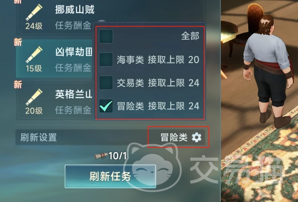 咱们在剧情推到主城之后将会解锁任务。玩家们可以在主城的任务介绍人这里进行任务的领取。在这里所有的任务类型总共有3个,它们分别是战斗,商业和冒险。玩家们可以根据自身的情况来选择接取任务类型。这次我们的任务主要介绍的是冒险类的任务。咱们在选择任务的时候勾选冒险类任务即可。在这款游戏里面玩家们接取的任务的上限是24级。这个上限玩家们可以通过组队获取到更高的任务上限。