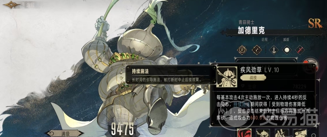先来看看加德里克的基本攻击,名为敲打,当他发动基本攻击时,能够对主目标造成攻击力150%的物理伤害,而他的战技叫做疾风劲草,这个战技有着独特的触发机制和强大的效果,具体来说就是每当加德里克进行4次基本攻击之后,他就会自动触发一次战技,一旦战技被触发,他就会进入到一个持续4秒的反击状态,在这个反击状态下,加德里克不仅能够继续对敌人造成伤害,还获得了一个非常实用的效果是受到物理伤害降低。