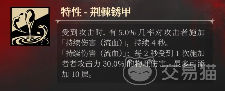 拜冯特的特性荆棘锈甲主要是针对于反击的效果,这一特性赋予了拜冯特在遭受攻击时可以进行一次输出,当拜冯特受到攻击时,有5%的几率触发荆棘锈甲特性,对攻击者施加持续伤害,即流血效果,这种流血效果并非简单的一次性伤害,而是持续4秒钟的折磨,在这4秒钟内,每两秒钟,攻击者都会感受到拜冯特30%攻击力的物理伤害。
